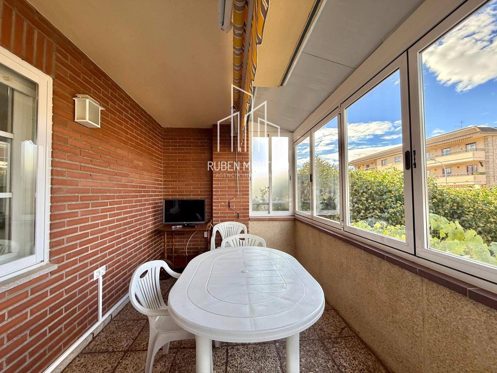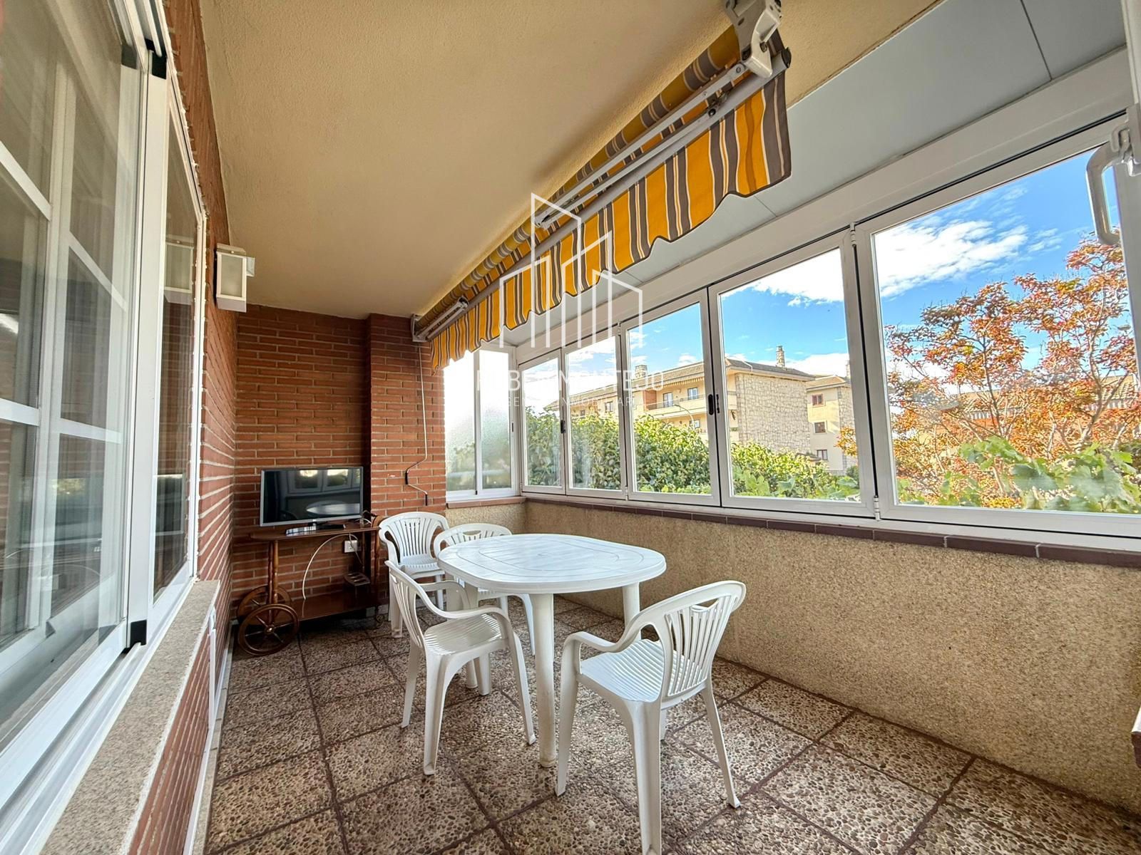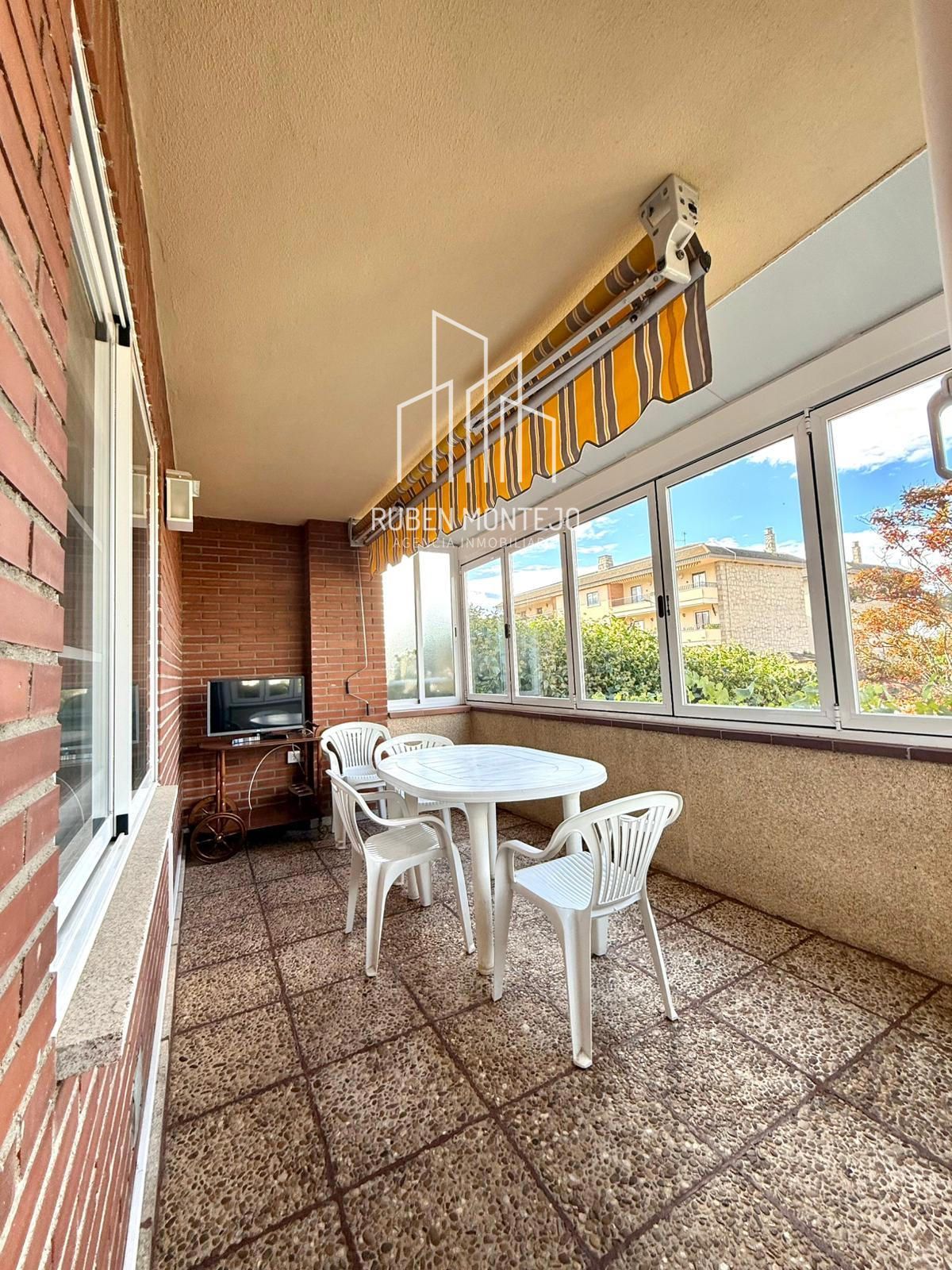 - Entrada a chalet con porche cerrado con ventanas que se recogen a un lado para dejarlo abierto durante el verano.